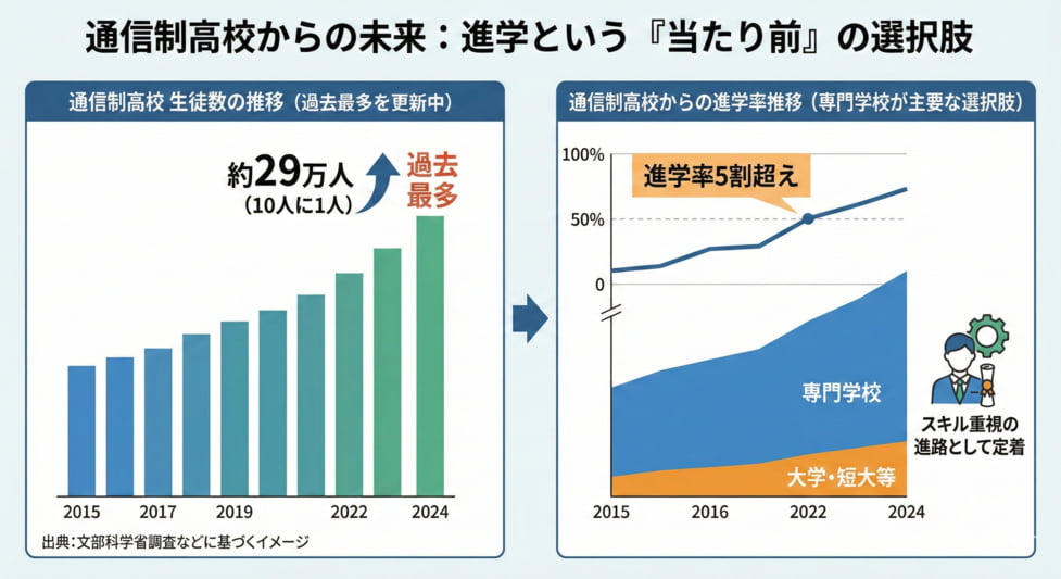 かつての「不登校の受け皿」というイメージは、もはや過去のものとなり、その先の進学率もついに5割を超えました。